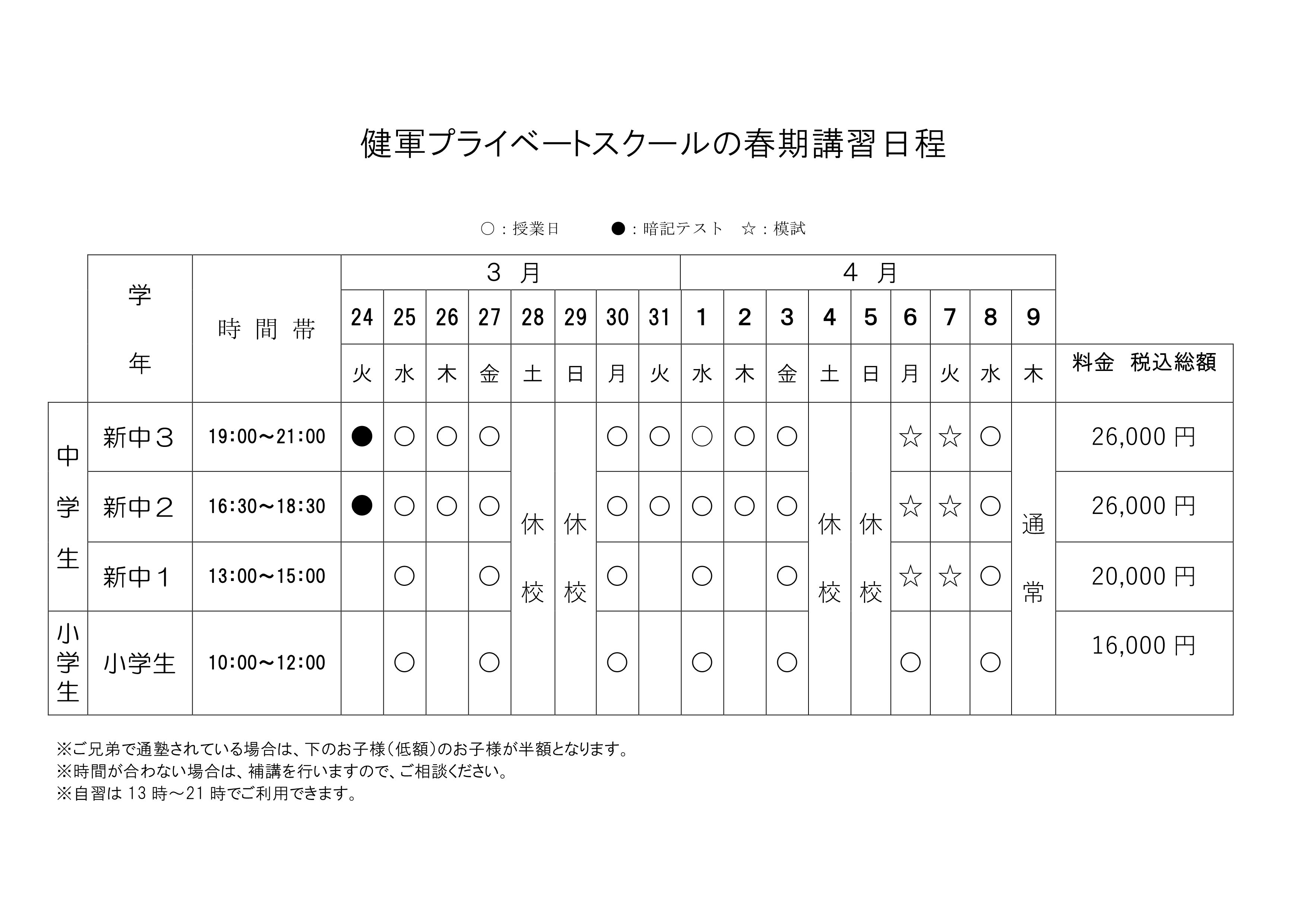 春期講習料金には消費税・授業料(中3は暗記特訓も)・教材費・模擬試験代などの全ての料金が含まれています。